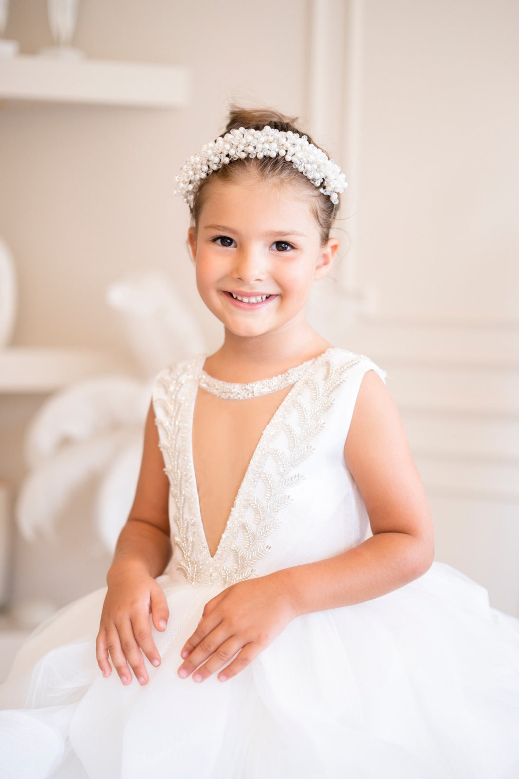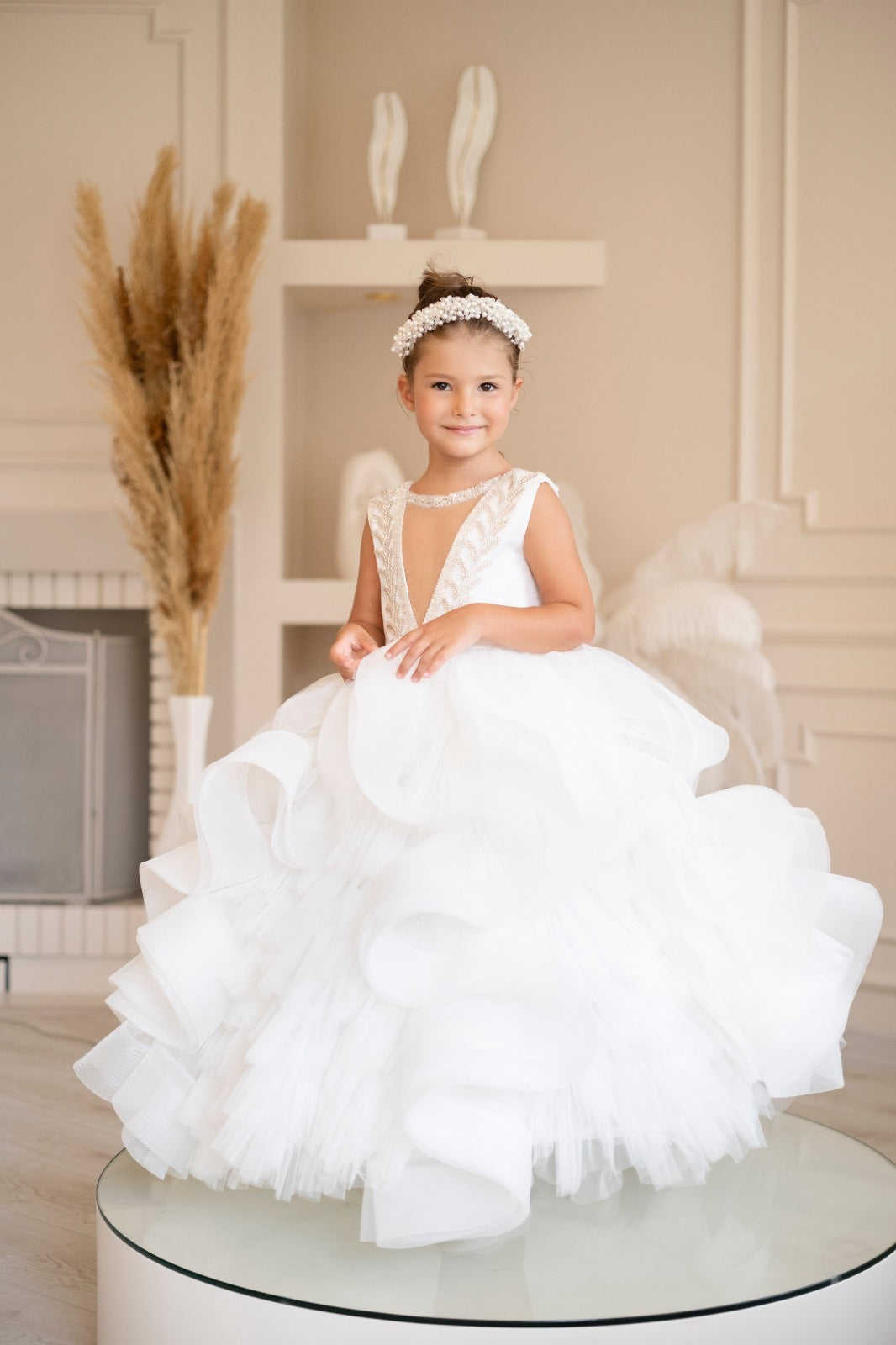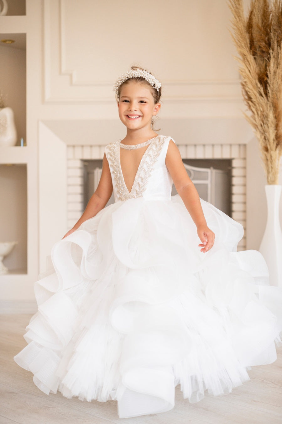 The white flower girl dress is a timeless and elegant choice for any wedding. Typically available in floor-length styles, these dresses are often made of high-quality satin or lace. They are adorned with delicate floral embellishments such as lace appliques, beading, or embroidered flowers. From simple and classic designs to more elaborate styles with layers of tulle or organza, the white flower girl dress symbolizes innocence and purity, making it a perfect addition to any wedding party.